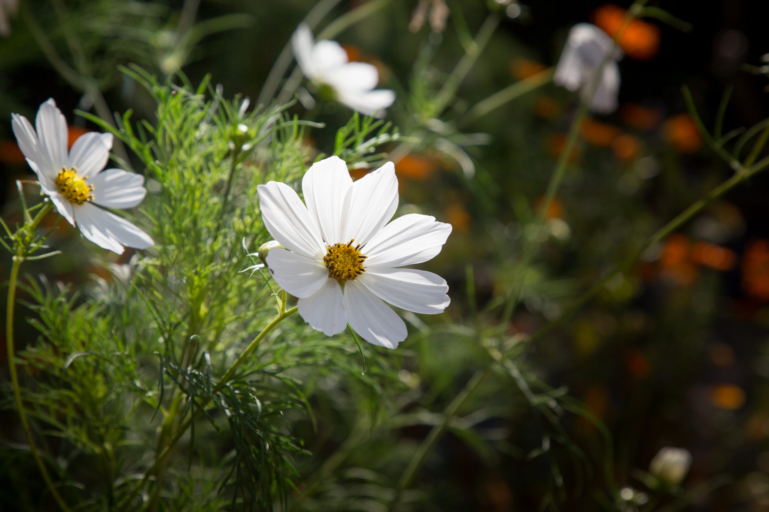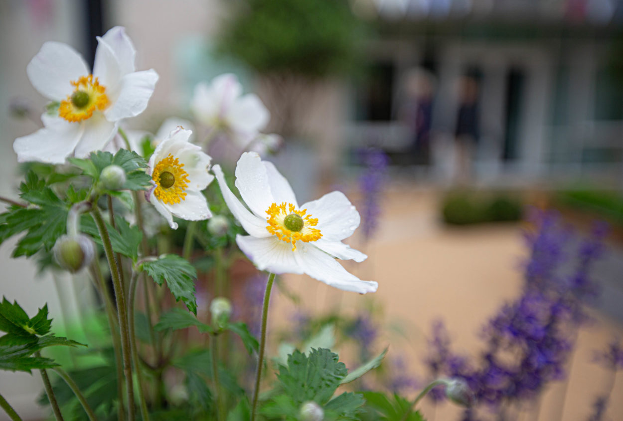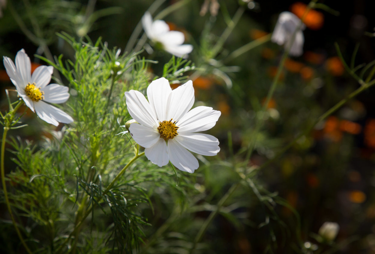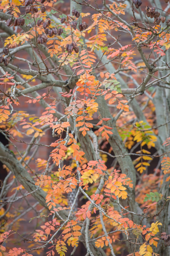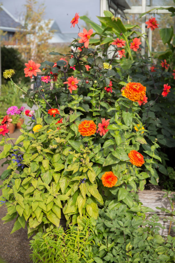 Now is also the time to plan for even more spectacular autumn colour next year if you didn’t last month. Take time to reflect on your planting and assess the palette in your garden now; take photos and note which areas or pots need improving. Here we have sedums (Hyletelephon), Japanese anemones, Salvia ‘cerro potosi’, the ornamental grass Hakonechloa macra ‘Aurea’, vibrant red and orange peony foliage, Verbena bonariensis and Dahlia ‘Thomas Edison’ in the borders, as well as cosmos, calendula, lobelia and the riotous golden, ruby and purple stems of rainbow chard in the raised beds, providing plenty of colour throughout the garden. Meanwhile Osmanthus provides a stunning Mediterranean scent with its diminutive but abundant flowers. Liquidamber styraciflua, Dicanthus cercidifolius, Nyssa sylvatica, Euonymus europaeus (spindle) and Rhus typhina (stag horn sumac) are all stunning if you have the space.