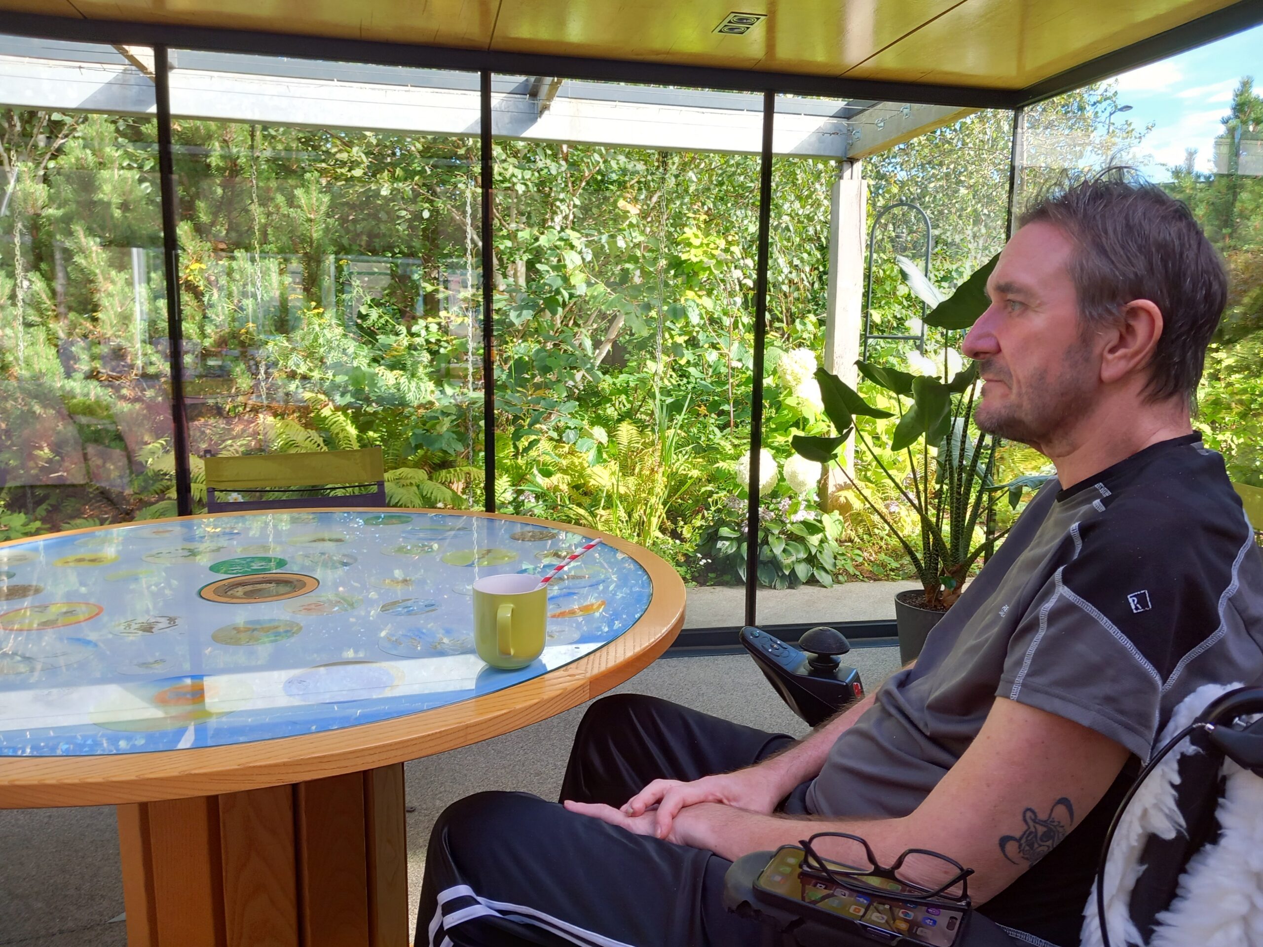 I tend to meet my family here; we like to gather round the table in the conservatory. It’s nice and private, away from the rest of the hospital – you can talk to your family about personal things – things that worry you. I will always remember sitting in here with my family the time I showed them a video of me walking. The faces of my daughters and my son were a picture which I’ll never forget.